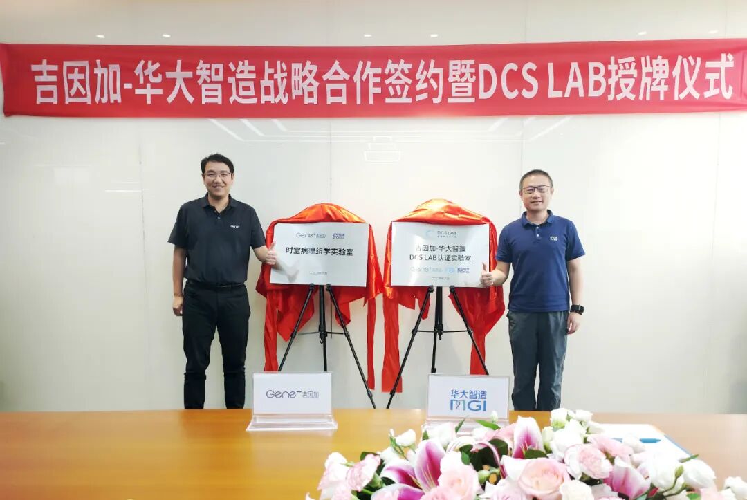 九游老哥俱乐部CEO易鑫(左)与华大智造首席执行官牟峰(右)代表双方企业揭牌